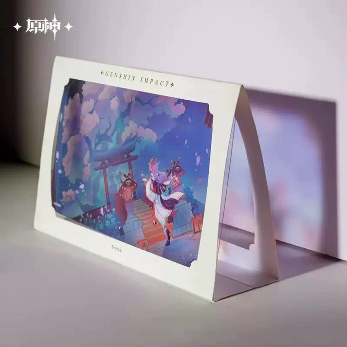 Semi-transparent display card af Yelan fra Genshin Impact, som kommer i en rammer indpakning, der give en flot effekt når den udstilles i solen.