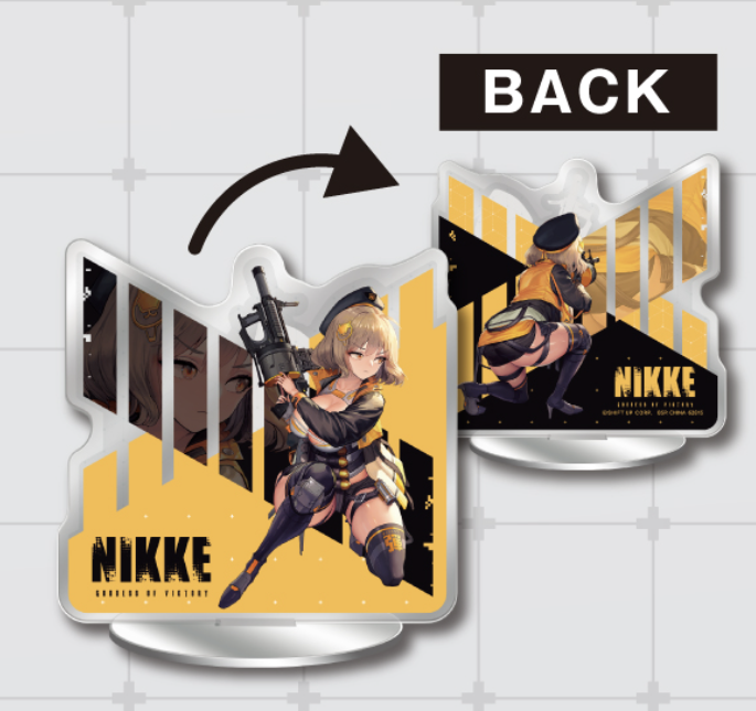 Cool acryl Stand figur, af Anis fra Nikke, med 2 sider, så hun kan udstilles i dækning, eller mens hun er i gang med at skyde.
