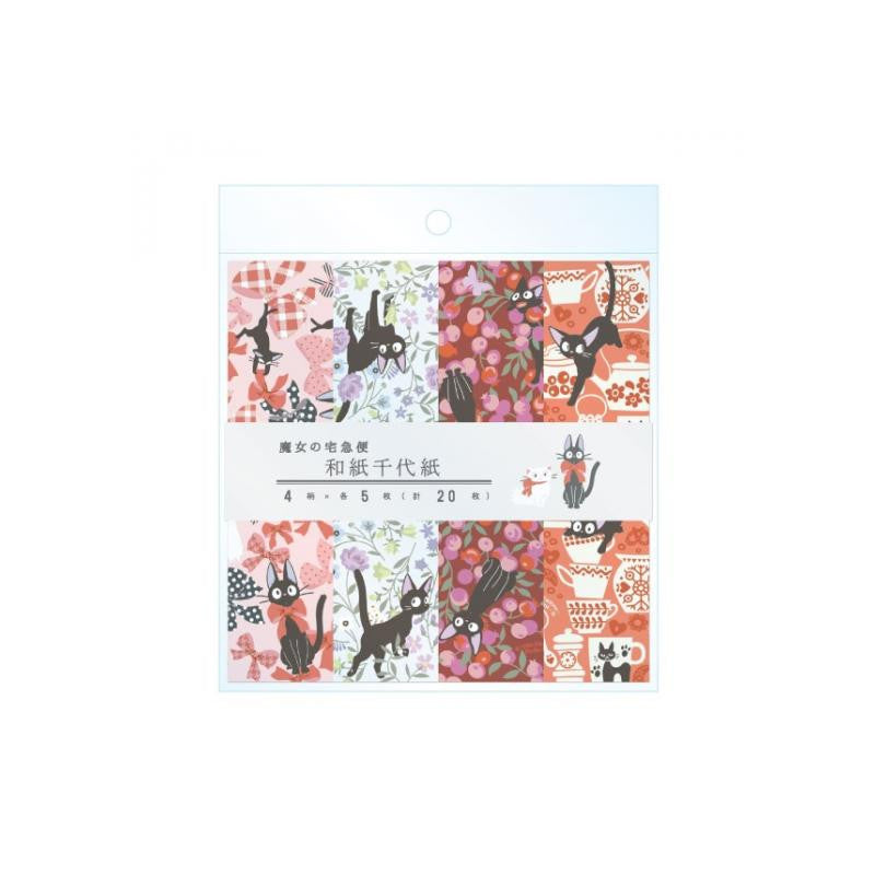 Sæt af 4 smukke og nuttede 'Kiki den lille Heks' Chiyogami papir med Jiji blandt blomster. Perfekt til for eksempel origami