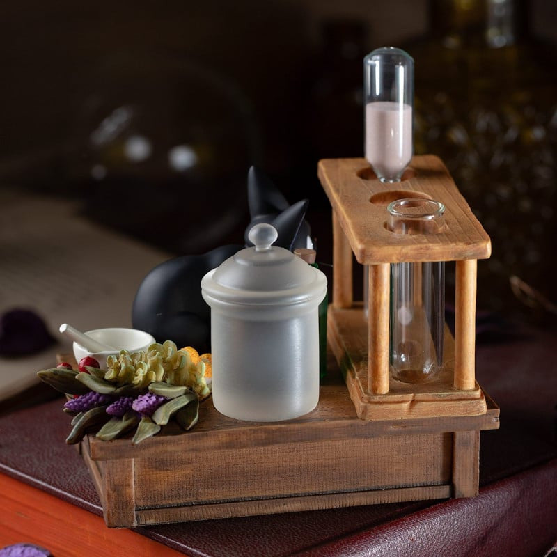 Tag et lille øjeblik af magien fra Kiki den lille heks med hjem, med en nuttede figur af Jiji der holder øje med sand-uret, som en del af et diorama hvor det ser ud som om at Jiji hjælper til med at lave en heksebrug.